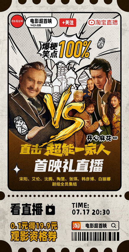 今晚8点30分,开心麻花新片《超能一家人》将在淘宝直播间开启电影首映礼。导演宋阳和主演艾伦、沈腾、陶慧、张琪等集体亮相,用户上淘宝搜索“电影超首映”即可观看。
