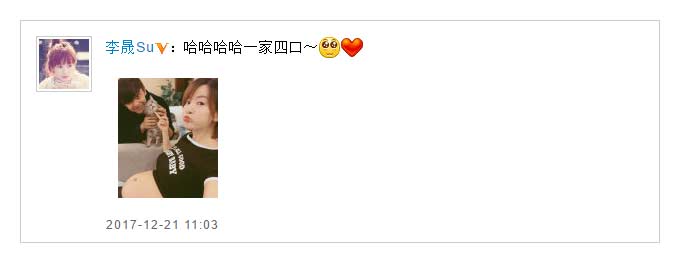 11月21日,“小燕子”李晟在网上宣布怀孕,她晒出一组和老公李佳航以及猫咪的合照,并配文:“一家四口”。随后老公李佳航转发称:“期待你的到来