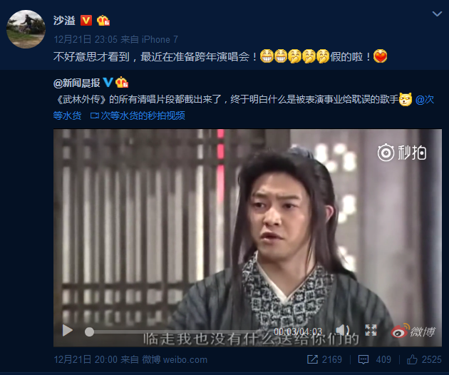 12月22日,新闻晨报微博发文:《武林外传》的所有清唱片段都截出来了,终于明白什么是被表演事业给耽误的歌手。并晒出武林外传众人演唱片段。沙溢回复:“不好意思才看到,最近在准备跨年演唱会!假的啦”
