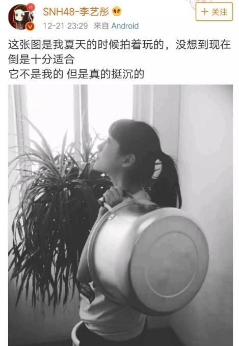 12月21日晚,SNH48冯薪朵黄婷婷宣布辞去N队队长职务后,李艺彤深夜晒出自己的背锅照并配文称“它不是我的,但是真的挺沉的”随即秒删,疑似回应队长辞职一事。21日晚冯薪朵、黄