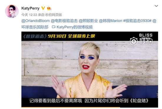 1“水果姐”凯蒂佩里发微博献唱《极致追击》