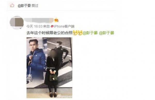 12月25日下午,彭于晏实力宠粉,接连点赞多位粉丝微博。其中有一位网友在微博上晒出了自己与彭于晏广告宣传照的合影并艾特彭于晏本人:“去年这个时候跟老公的合照”,随后彭于晏本人点