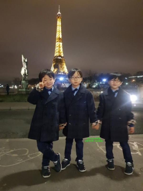 而宋一国任职法官的妻子郑升妍今年8月起赴法国巴黎进行海外研修一年,故三胞胎也会同行。三胞胎于10月时曾返韩出席釜山电影节,其后则回到法国,最近三胞胎的近照于网上公开,他们于25日在巴黎铁塔前留影,三兄弟手牵手之余,其中民国更摆V字手势卖萌,相当可爱!