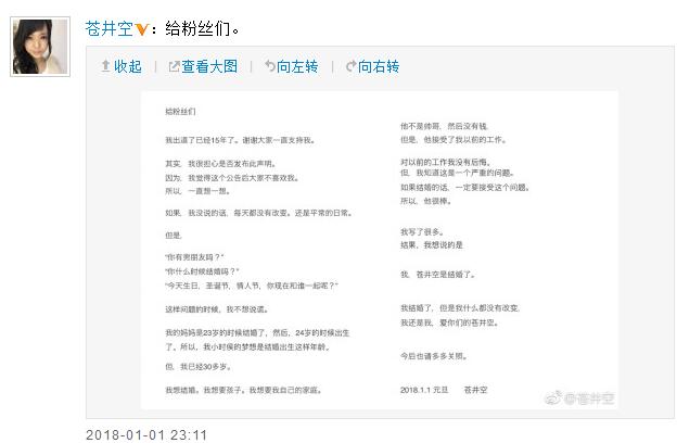 2018年1月1日,苍井空在微博公布结婚喜讯,称男方“他不是帅哥,然后也没有钱,但他接受我以前的工作”。