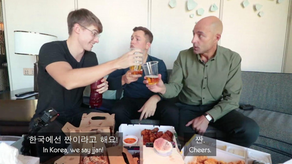 视频中,早有准备的外国小哥拎着满满的“诚意”来到酒店,与《王牌特工2:黄金圈》的两位主演“蛋蛋”和“梅林”见面。几句寒暄之后,小哥拿出了这次准备的终极大礼,韩国“网红”美食标配——炸鸡与啤酒。“蛋蛋”和“梅林”满脸期待,二话不说直接上手,享用起了美食。炸鸡与啤酒的威力也着实惊人,很快就让二位折服,纷纷赞不绝口。吃惯了英国炸鸡和美式炸鸡的他们,还是第一次见识到这么多韩国口味的炸鸡。无论是辣味炸鸡、芝士炸鸡还是米粒炸鸡,都让二位大开眼界,吃到停不下来。“蛋蛋”更是将他私人教练的叮嘱抛在脑后,当下还是享受美食最为重要。网友们也是纷纷感叹:“一看就都是吃货,鉴定完毕哈哈哈!”“前有千颂伊都教授,后有王牌特工,炸鸡与啤酒威力太大!”“是不是应该来一场雪更应景呢?”
