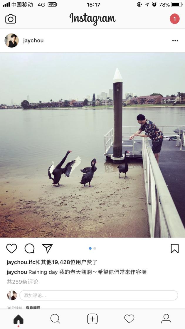 周杰伦澳洲悠闲喂天鹅:我的老天鹅 常来做客喔