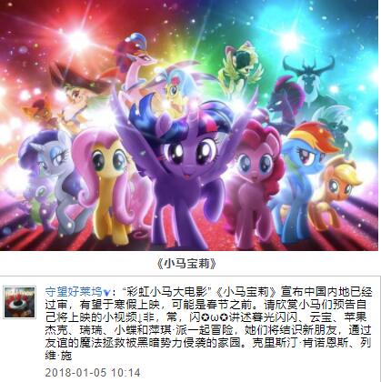 北京时间1月6日消息, “彩虹小马大电影”《小马宝莉》宣布中国内地已经过审,有望于寒假上映,可能是春节之前。
