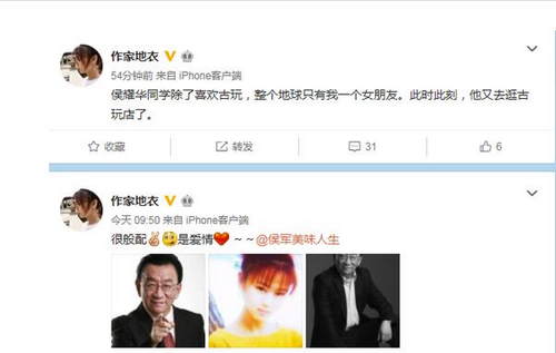 女作家自曝和侯耀华相恋近日,一位名为“作家地衣”微博加V认证的女网友公开“认爱”侯耀华,发文表示:“整个地球侯耀华只喜欢我一个人&rdquo