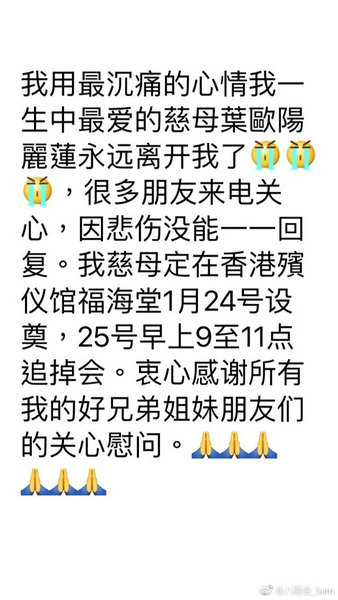 他写道:“我用最沉痛的心情,我一生中最爱的慈母叶欧阳丽莲永远离开我了,很多朋友来电关心,因悲伤没能一一回复。我慈母定在香港殡仪馆福海堂1月24号设奠,25号早上9至11点追悼会。衷心感谢所有我的好兄弟姐妹朋友们的关心慰问。”