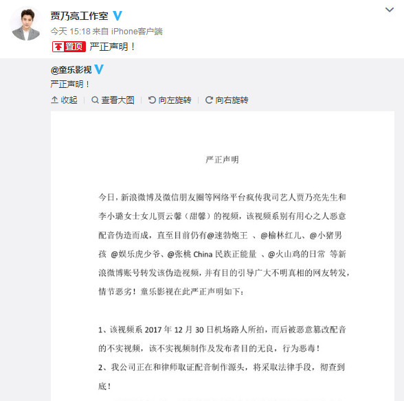 贾乃亮公司发表严正声明 将严惩恶意造谣者