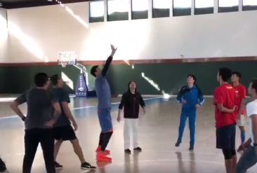 视频里的孙杨穿着蓝色运动服,人高马大的他在人群里十分抢眼。传球、投篮等动作也是娴熟出色,令人惊叹。