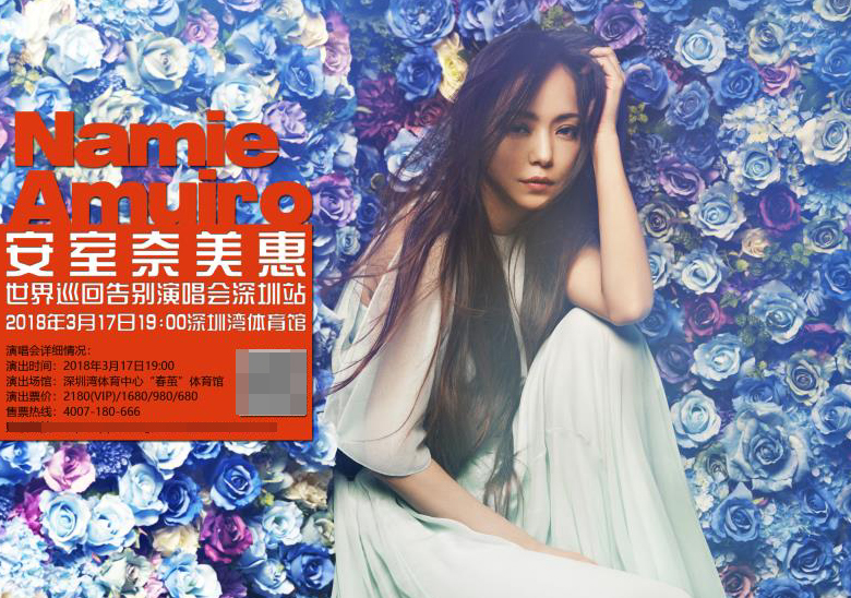 备受瞩目的安室奈美惠世界告别巡回演唱会海外首站官方宣布强势登陆深圳,演出日期确认为2018年3月17日在深圳湾体育中心“春茧”体育馆举行。消息一出立刻引爆了广大粉丝的热情;据悉,歌迷们最关心的购票信息已于1月23日在趣票网发布并开启预售;而本次安室奈美惠世界巡回告别演唱会海外首站深圳站由华人音乐世界(北京)文化有限公司、微博、飞凡有限公司Unusual Entertainment Pte Ltd、深圳悦天文化传播有限公司、飞朵文化传播(天津)有限公司联合主办,各方主办单位力求在2018年的娱乐盛筵中,以亚洲歌坛顶级歌姬安室奈美惠的告别个唱作为奉献给爱乐发烧友与其粉丝们的开年饕餮大餐。