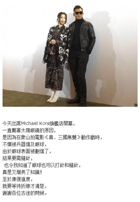 28日上午,古天乐在其本人微博发布了一条长微博。长微博中解释了自己出席某品牌旗舰店开幕活动时佩戴墨镜的原因并对“古迷”们对自己的关心表示了感谢。古天乐称,自己在拍摄古装动作电影《真三国无双》的动作戏时不慎被兵器伤及眼球导致需要打针和缝针。在微博的最后古天乐还幽默地调侃自己刚知道眼球也可以打针和缝针:“真是又增长了知识!”