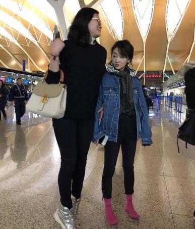 照片中周冬雨身穿牛仔,黑裤子,粉袜子,一双鞋子不翼而飞。而她正一脸状况外的盯着她身边,踮着脚比她高出一个头的女子。