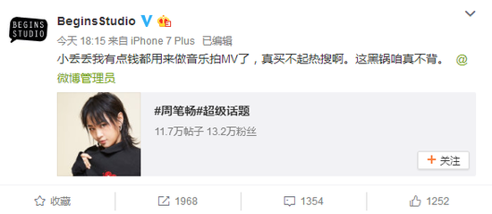 近日,微博热搜将进行全面整改引发热议。28日下午,“微博管理员”公布了一份存在刷榜行为的名单,名单中不少明星纷纷躺枪,周笔畅也是其中一个。随后,周笔畅工作室发文否认刷榜:“小丢丢我有点钱都用来做音乐拍MV了,真买不起热搜啊。这黑锅咱真不背。”