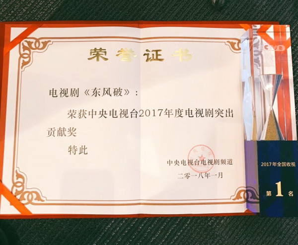 2018年刚一个月,天沐影业拿奖不断,先是《学生兵》荣获广西卫视年度最具影响力电视剧,再是湖南经视颁给天沐影业优秀电视制作公司奖,今日,又一喜讯传来,《东风破》荣获中央电视台2017年度电视剧突出贡献奖,而天沐影业也作为《东风破》的制作机构被中央电视台评为2017年度突出贡献制作机构,可谓是新年开门红。