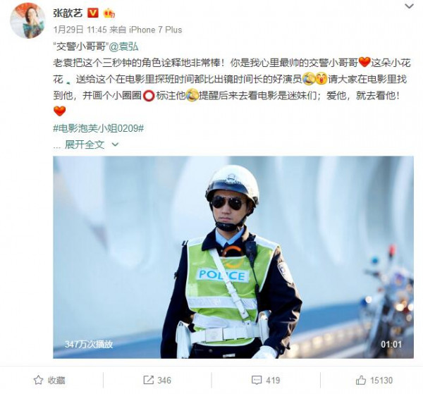 临近春节,各大春节档电影都开始了一系列的宣传活动。29日,张歆艺通过微博晒出其自导自演新电影《泡芙小姐》的视频花絮。视频中,袁弘为了表达对妻子的支持,亲自出演片内的一名交警,然而整个镜头只有3秒钟。网友戏称:三秒也是爱,袁弘太宠老婆了!