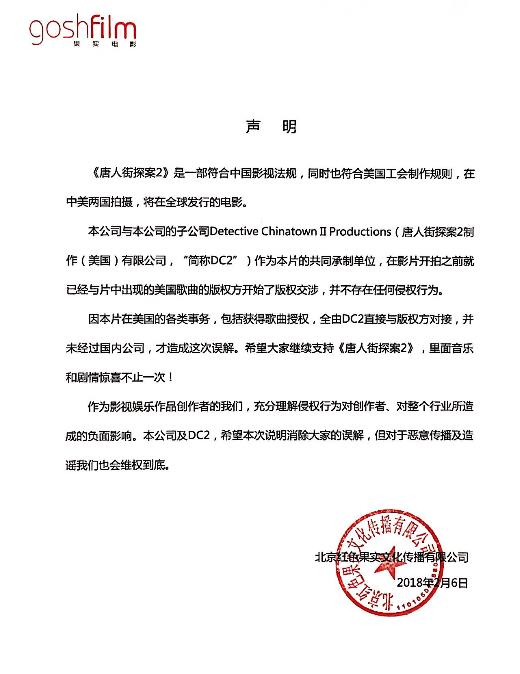 针对此事,《唐人街探案2》制作方发表声明,称影片开拍前已就片中出现的美国歌曲的版权方开始了版权交涉,并不存在侵权行为。