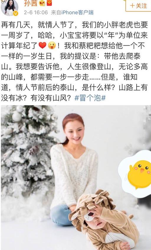 2018年2月14日,是孙茜的儿子小胖老虎的一周岁生日,接下来的小宝宝就要以“年”为单位来计算年纪了。孙茜和老公蔡远航想给儿子一个不一样的一岁生日,所以他们就想带着他去爬泰山“我想要告诉他,人生很像登山,无论多高的山峰,都需要一步一步走”。