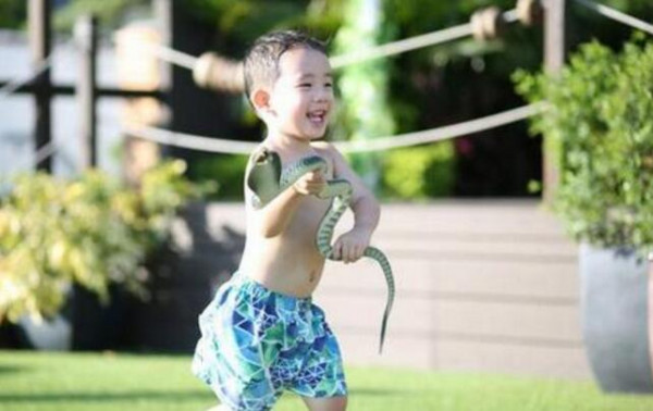 Jasper穿花短裤奔跑欢快 手拿假蛇笑容阳光