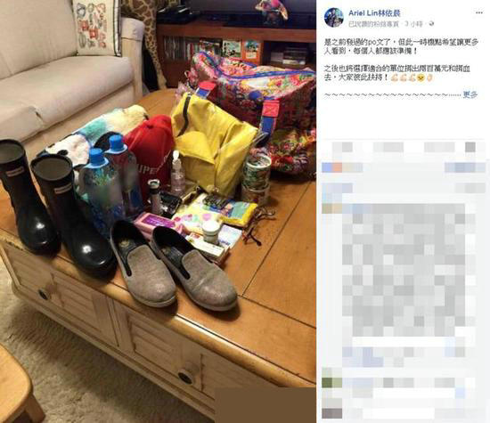 林依晨分享地震包准备方法据台湾媒体报道,台东花莲6日晚发生大规模的地震,至今仍余震不断,各界纷纷伸出援手帮忙,有钱出钱、有力出力,像“零负评女神”林依晨除了表示捐出200万元外