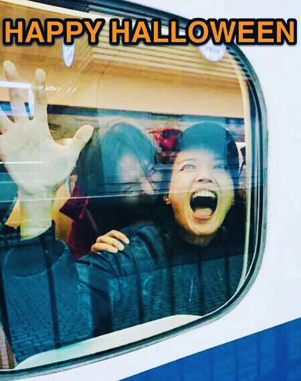 照片中,可见舒淇穿着黑色外套、头上戴着帽子,举起右手、身体贴在列车窗户上,张大嘴巴露出惊下的神情,而老公冯德伦则穿红色外套,右手按着娇妻的肩榜,作势张嘴要咬她;冯德伦则写下“万圣节快乐”,并附上一个南瓜的贴图。