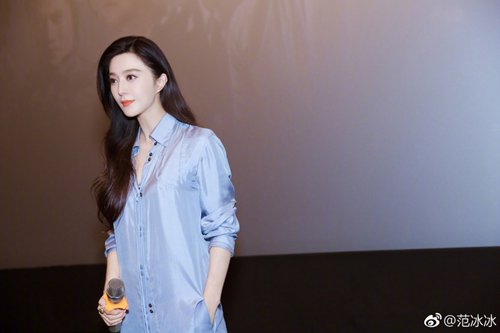 》路演的照片,范冰冰身穿浅蓝色外套,端庄优雅尽显美艳。