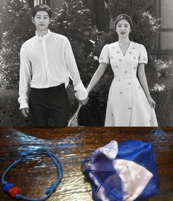 10月31日,宋仲基和宋慧乔在首尔举办婚礼,二人为到场嘉宾准备的答谢礼是韩国传统手链,手链中有蓝色红色的古典绳结,并用蓝色布袋包裹着。