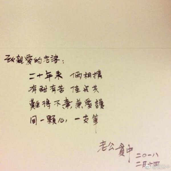 2月14日,黄贯中在微博上晒出给老婆朱茵的告白情书,并配文:我永远爱你直到上帝化了灰,这笔真耐用。情书内容写道:二十年来,俩相携。有甜有苦,同一颗心,同一支笔。并署名老公贯中。情人节甜蜜告白写诗令网友
