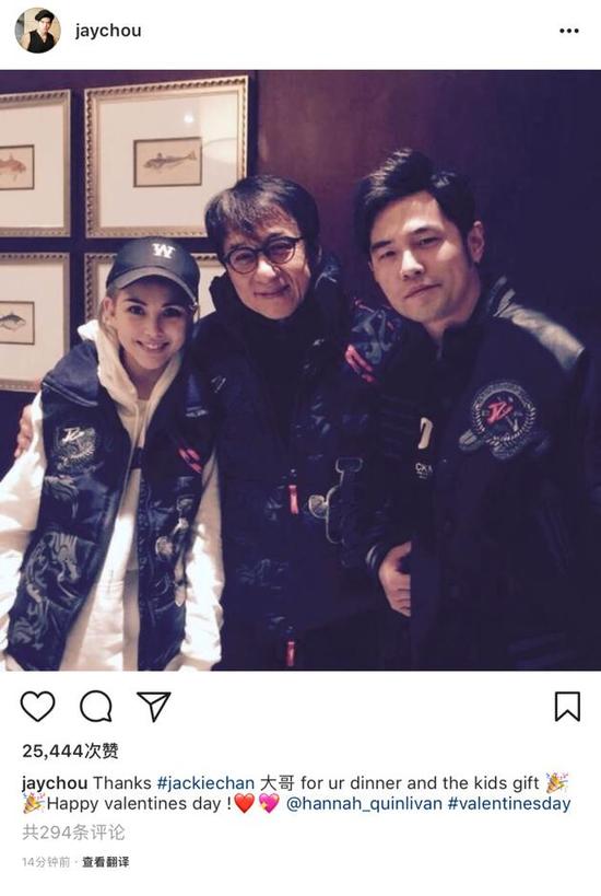 2月14日,周杰伦晒出携爱妻昆凌和成龙一起共进晚餐的合影,周杰伦还配文感谢成龙大哥请客以及送给小朋友礼物。粉丝的关注重点却是周杰伦的身材,有粉丝留言:“我伦还是依然瘦啊”,也有人调侃:“珍珠奶茶可以继续喝”。