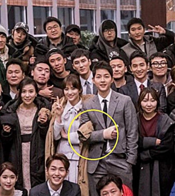 日前,有网友扒出一张双宋拍《太阳的后裔》时全剧组的合照,那时候宋仲基因为拍戏胳膊受伤严重,拍合照时候宋慧乔不方便挽着他的胳膊,所以就把风衣的袖子塞到了宋仲基的胳膊里,让宋仲基挽着她的袖子作为代替。
