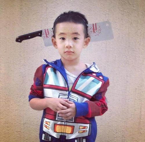 应采儿还贴心配上了Jasper的节日近照,照片中Jasper乖乖巧巧地站在镜头前,两手轻扣搭在胸前,无论是卡通外套还是里面的白T都向一边倾斜,搭配着他清秀可爱的五官,更显得无辜又天真。应采儿配合节日气氛,在他的脑袋上p上了一把血淋淋的刀,然而总体看上去却一点儿也不恐怖。