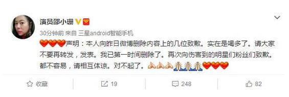 邵小珊发布诋毁赵薇范冰冰言论后致歉:喝多了