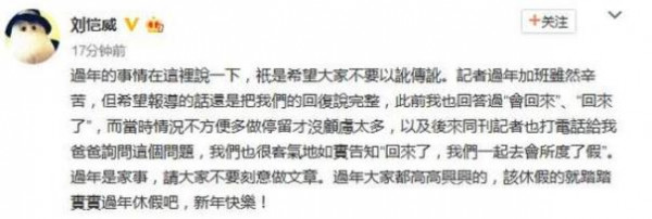 日前港媒报道刘恺威与父母及小糯米吃饭未见杨幂,媒体称问到太太是否返港过年时刘恺威没有回答,刘丹也只是笑而不答,再度引发网友热议。20日中午刘恺威就此事发微博表示杨幂有去香港一起过年,全家一起去会所度了假,望大家不要以讹传讹。