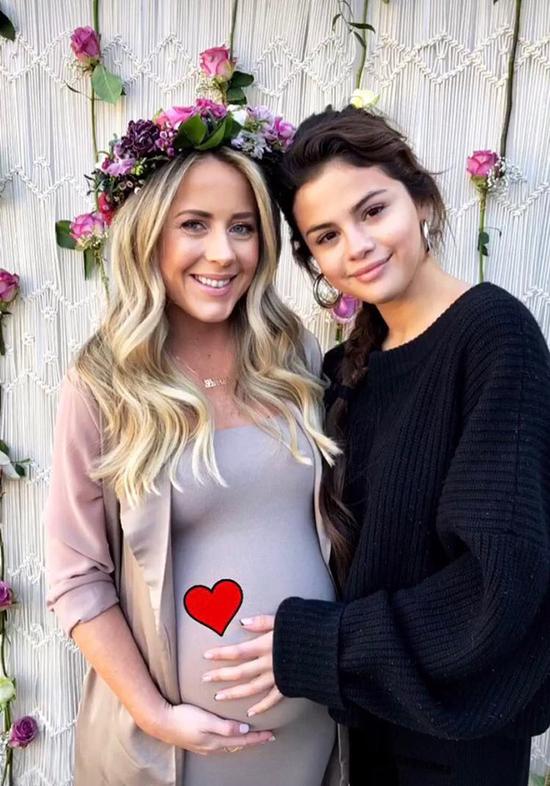 赛琳娜与好友合影据外媒报道,日前25岁的赛琳娜·戈麦兹参加好友的宝宝迎新会。她与头戴花环的准妈妈合影,一手轻抚好友的肚子,面带温婉和煦的笑容。赛琳娜没有化妆,皮肤红润光滑,穿了一件黑色的