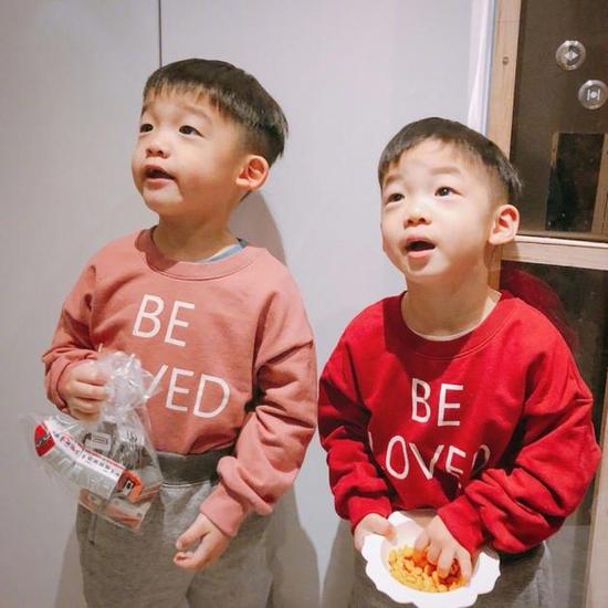 范玮琪双胞胎儿子日前,范玮琪晒出双胞胎儿子的可爱萌照,照片中,两个小家伙穿着一红一粉T恤衫,站在墙角抬头看上上方,兄弟俩张着可爱的小嘴,表情神同步,非常的呆萌。网友看到照片后留言称:“两个