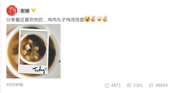 2月28日,谢娜晒出自己最近喜欢的美食,鸡肉丸子鸡汤挂面,看上去让人食指大动。