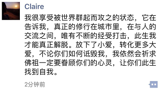 但“小二姐”似乎未受到任何影响,继续更新朋友圈,转载各家媒体报道。今日更是发文,称“我很享受被世界群起而攻之的状态,它在告诉我,真正的修行在城市里,在与人的交流之间,唯有不断的经受打击,此生我才能真正解脱。放下了小爱,转化更多大爱,不论你们如何诋毁我,我依然会祈求佛祖一定要眷顾你们的心灵,让你们此生找到自我。”