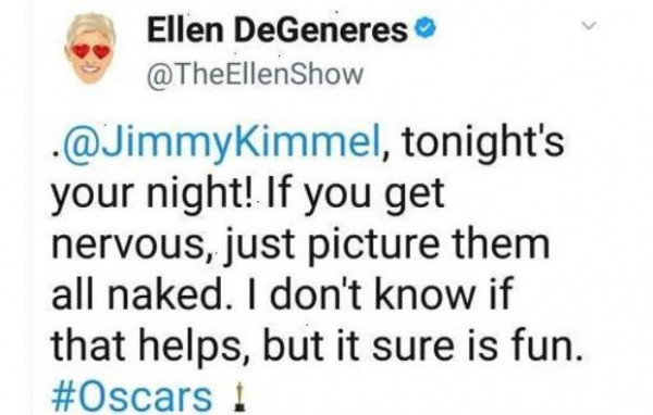 北京时间3月5日,第90届奥斯卡颁奖典礼如期举行,在典礼开始前发生有趣一幕。在同样曾为奥斯卡主持人的艾伦发推给吉米,说今夜是属于他的高光时刻。如果他觉得紧张的话,就把台下的来宾都想象成全裸的样子。