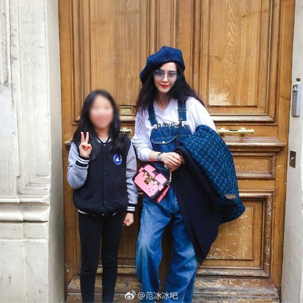 照片中,范冰冰戴着墨镜、帽子,身穿长袖白T配吊带牛仔裤、斜背着一个粉包,右手上挂着深蓝色大衣,见到粉丝个头娇小,她摆出膝盖微弯、蹲低身子的姿势更靠近对方,面对女神如此亲民的一面,该粉丝事后写道:“不感相信居然能和明星范冰冰合影,还要到了签名。”