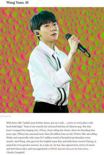 王源日前,美国《时代》杂志评出2017年30位最具影响力的青少年,米莉·波比·布朗、米凯拉·厄尔默、肖恩·蒙德兹、艾丽·范宁、玛蒂