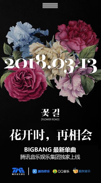 在新曲即将上线腾讯音乐娱乐集团旗下的QQ音乐、酷狗音乐、酷我音乐三大平台独家上线的消息刚出来时,腾讯音乐娱乐就携粉丝们一起与哥哥们约定,“以此单曲,花开时再相会”,粉丝们更是直言“期待我们BIGBANG,哥哥我们要一直走花路”。