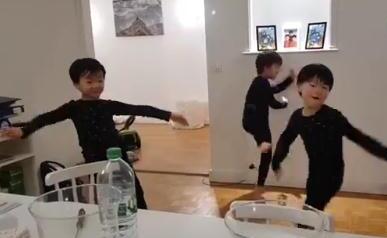 视频中,三小只穿着星星紧身秋衣,在家中的地板上翩翩起舞,他们时而跳跃,时而随着音乐扬起手臂,动作别有一番舞者味道。
