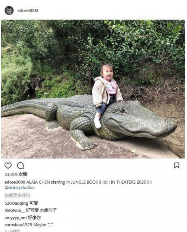 3月17日,晒娃狂魔陈冠希在个人社交网站上晒出女儿Alaia的近照,照片中Alaia穿着暖和,头发微有些凌乱但更显得可爱,最让人惊讶的是,Alaia是骑在一头“鳄鱼”身上拍这张照片的。身为老爸的陈冠希看到骑着“鳄鱼”的女儿也十分激动,配文道:“Alaia主演《奇幻森林8》!将会在2025年上映!”还打了好几个感叹号。