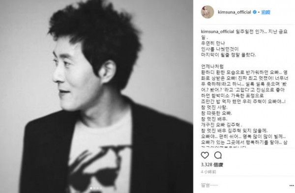 金宣儿4日在IG上PO出金柱赫的照片,“是一周前吗。。。上个礼拜五,我们偶然相遇,我不知道,那会是最后一次打招呼。”对方当时用一贯灿烂的表情欢迎她,由于金柱赫稍早才在《The Seoul Awards》上夺得最佳男配角奖,她开心地道贺:“得了电影奖的哥哥!真的最帅气了!非常非常恭喜你”对方则笑着说:“你看到了?看到了吗?…谢啦!”两人也约好“下次一起吃顿饭”,没想到这竟是最后一次相见。