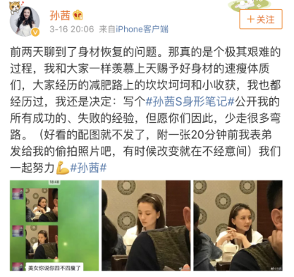 3月16日孙茜发微博,为了让网友们更加全面的了解如何减肥塑身,孙茜打算将一路以来的减肥塑身方法和经验无保留公开,写成“孙茜S身形笔记”,希望能为像她一样崇尚健康生活,追求美丽人
