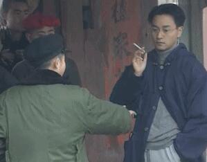》北京拍摄现场花絮图,画面中张国荣单手持烟揣摩剧情,不时比划剧中动作,将优雅二字发挥的淋漓尽致。