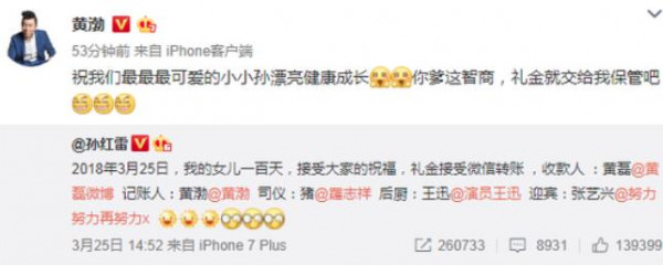 25日是孙红雷女儿满百日的日子,女儿控孙红雷也在网上开起了玩笑:“2018年3月25日,我的女儿一百天,接受大家的祝福,礼金接受微信转账。”并给各位兄弟都分配好了工作,“收款人 :黄磊;记账人:黄渤;司仪:猪; 后厨:王迅;迎宾:张艺兴。”