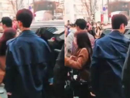 视频中身高185cm的昌珉站在人群中格外显眼,身穿深蓝色外套的他背对着镜头,看到眼前黑短发女生背对突然发动的车子,立马伸出右手霸气把对方往怀里拉,避免女方被车擦过的危险,同时他转头盯着车子离去的方向,直到车子离开后才回头、迈开步伐往前走。