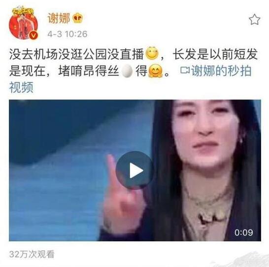 4月3日,谢娜在微博澄清了一些不实消息:近日有在机场和公园偶遇谢娜,以及谢娜产后直播的消息在网络上传播。谢娜配文称:“没去机场没逛公园没直播,长发是以前短发是现在,你们懂的。”并分享了一段搞笑视频,言辞幽默令人捧腹。
